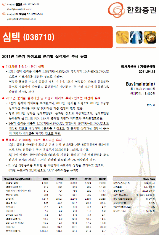 2011년 1분기 저점으로 분기별 실적개선 추세 유효 - 한화증권